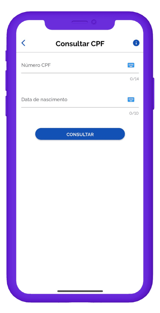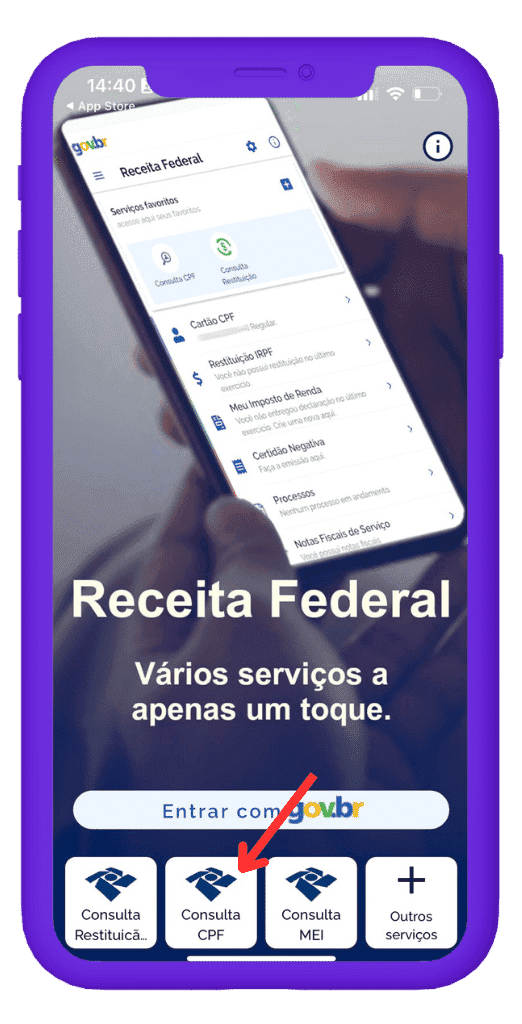 1. Baixe o app da Receita Federal, que está disponível para Android ou iOS; 2. Em seguida, abra o app e clique em “Consulta CPF“