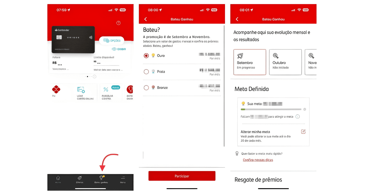 Imagens da tela do Santander Way da promoção Bateu Ganhou