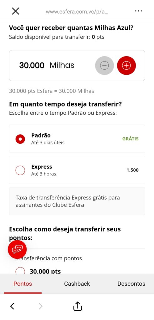 7. Por lá, você pode selecionar quanto pontos quer transferir e em quanto tempo vai receber o saldo na Azul. É necessário ter no mínimo 30 mil pontos Esfera para fazer essa transferência.