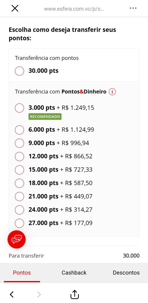 É possível inteirar a quantidade da transferência com dinheiro pela opção “Pontos&Dinheiro“.