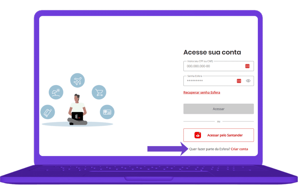 Crie sua conta gratuita com antecedência: Acesse o site ou app da Esfera e faça seu cadastro. É rápido, gratuito e não é preciso ser cliente Santander.
