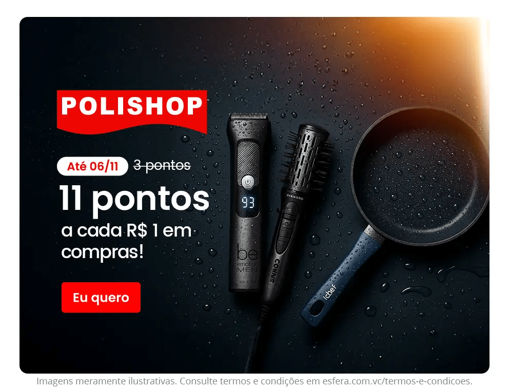 Compras online: A Esfera tem parceria com as maiores varejistas do país (Amazon, Magalu, Ponto, Casas Bahia, Netshoes, etc.). Ao iniciar sua compra pelo site da Esfera, você ganha pontos sobre o valor total do pedido.