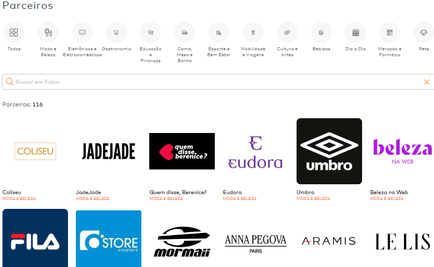 As parcerias são diversificadas, portanto, conseguem agradar diferentes públicos. Elas são: restaurantes (do fast food ao a la carte), viagens, moda, alimentação, saúde, academia, entre outros.