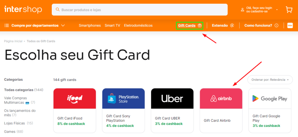 Assim que estiver liberado, no próprio Super App busque por Inter Shop, depois por Gift Cards, conforme mostramos na imagem abaixo.
