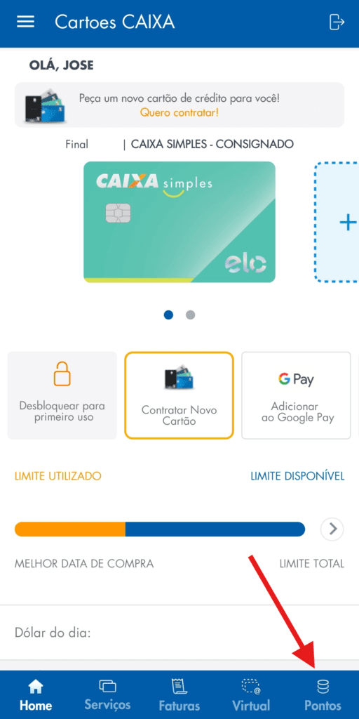 Clique em “Pontos” para ver o extrato de pontos, sado total e resgatar pontos.