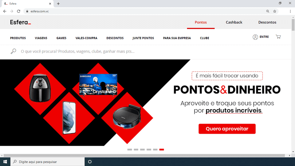 Resgatar pontos Esfera: Viagens; Serviços; Produtos; Cashback; Pontos & Dinheiro.