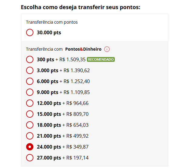 Em vez de esperar semanas ou até meses para juntar os pontos restantes (e perder o bônus), você pode selecionar a transferência de 30.000 pontos e usar a opção “Pontos + Dinheiro”.