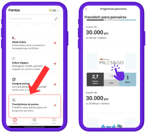 - No menu principal, role a tela e selecione a opção “Transferência de pontos“.