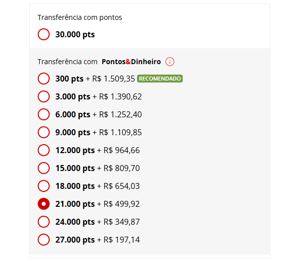 Na hora de transferir os 30.000, por exemplo, você tem apenas 21.000. Com essa função, você consegue complementar os 9.000 pontos faltantes em reais na mesma hora, que nesse caso daria R$ 499,92.