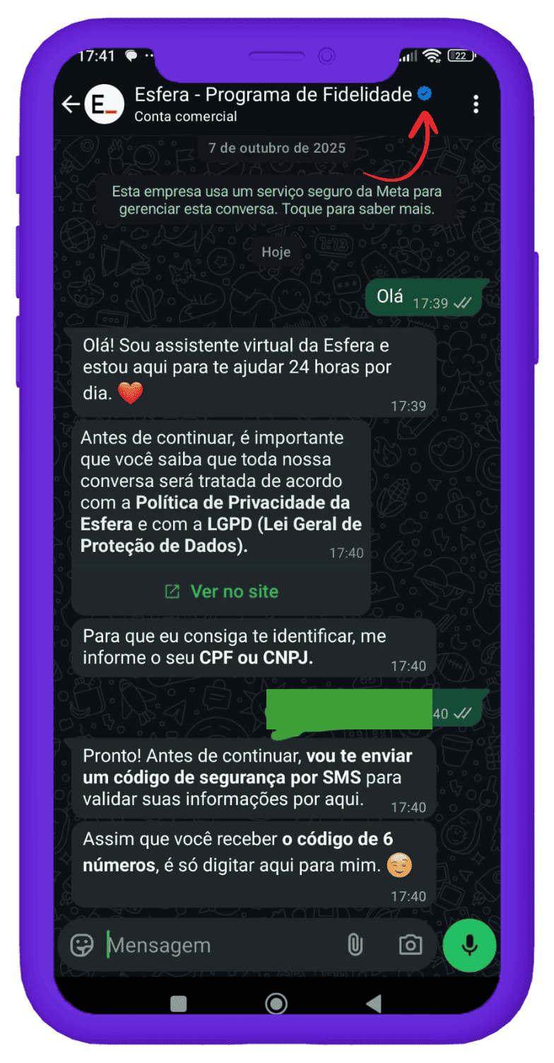 Sim, o WhatsApp Esfera é um meio totalmente seguro para tirar suas dúvidas ou consultar outras informações relacionadas ao programa de fidelidade.