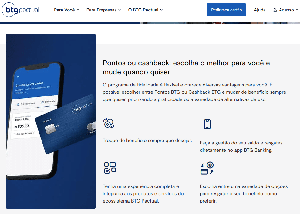 O programa permite que todo cliente das variantes cartão BTG Black, cartão BTG Platinum ou Ultrablue escolha entre dois benefícios: cashback BTG ou pontos BTG, com possibilidade de trocar a qualquer fechamento de fatura.
