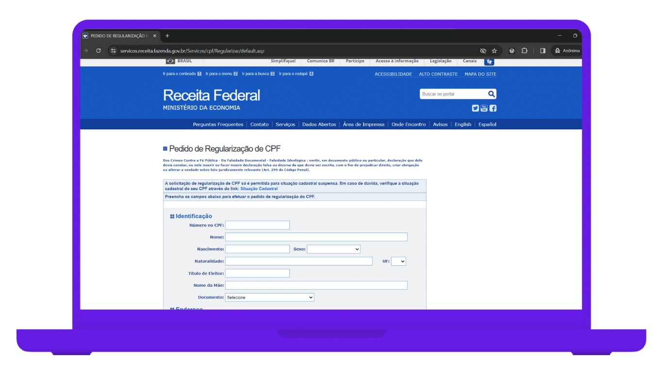 Lembre-se: de acordo com a Receita Federal, essa solicitação de regularização só é permitida em caso de CPF suspenso. Por isso, em caso de dúvida, basta conferir a situação cadastral do seu CPF.