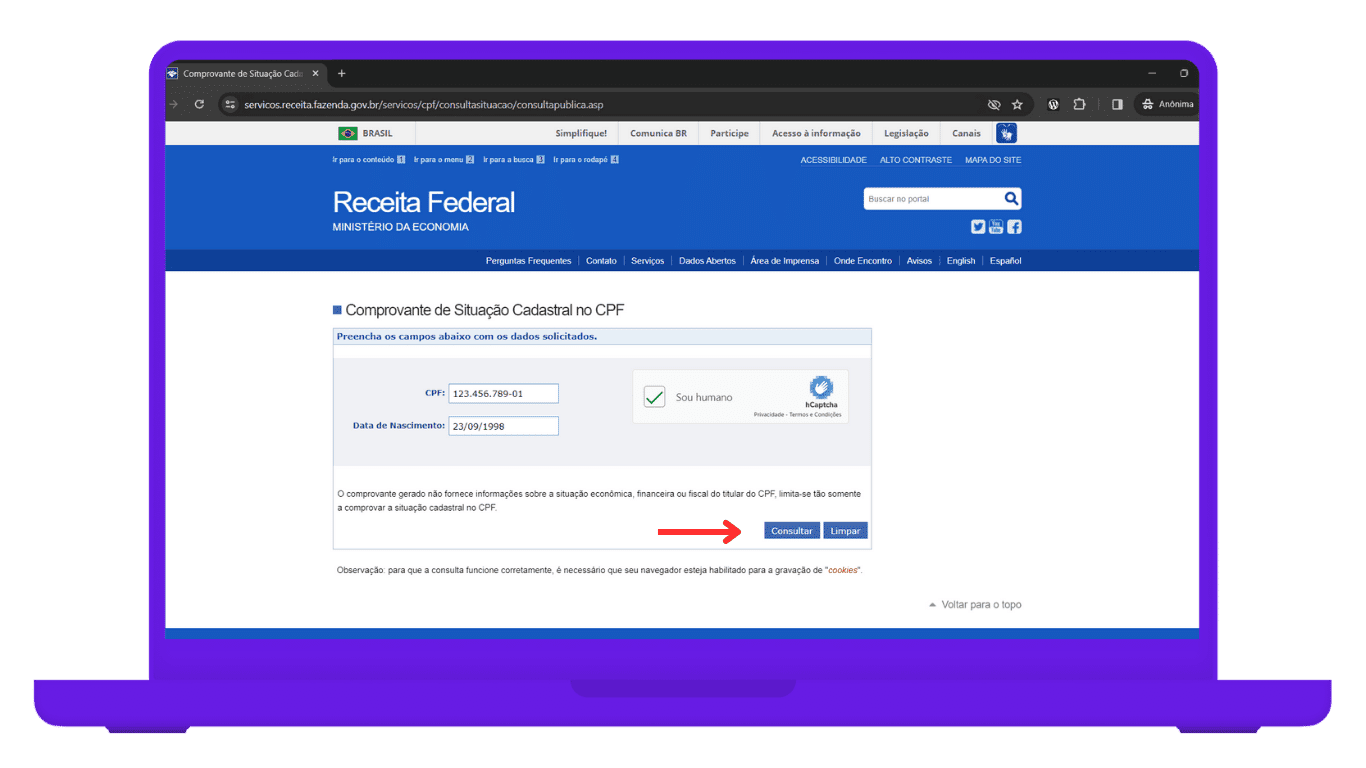 - No site da Receita Federal, adicione seu CPF e data de nascimento, clique em “Sou humano” e, em seguida, em “Consultar”;
