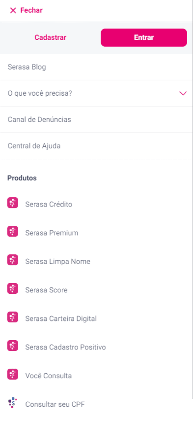 Para isso, ao entrar no site do Serasa, basta ir em “☰ Menu” na parte superior da tela;