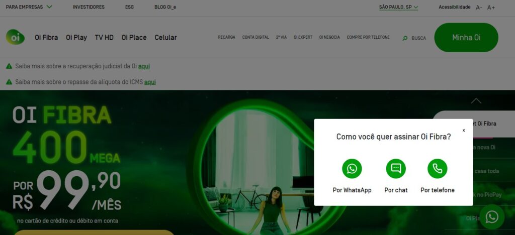 Outra forma de entrar em contato com a Oi Empresarial é por meio do chat online, disponível no site da empresa.