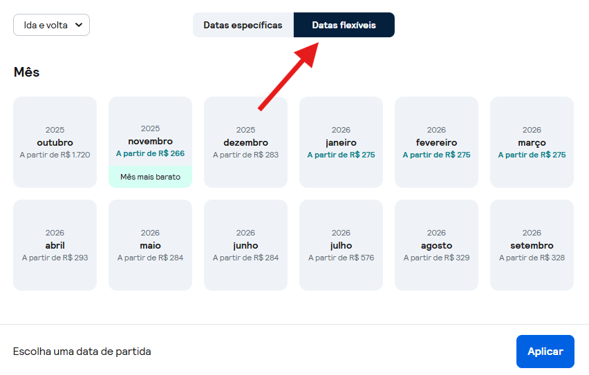 Isso permitirá visualizar um calendário de preços e identificar os dias mais baratos para voar. Muitas vezes, adiar ou antecipar a viagem em um ou dois dias pode resultar em uma economia considerável.
