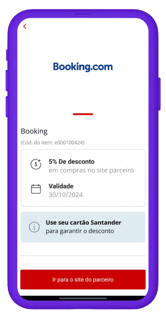 Na Esfera você também consegue 5% de desconto na aba “Desconto” do app em reservas da Hoteis.com. É necessário usar um cartão Santander para garantir o desconto.