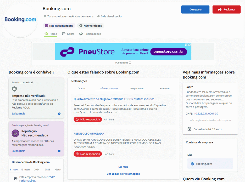 Um dos canais mais usados para isso é o Reclame Aqui. Por lá, a Booking.com possui uma reputação como “Não recomendada” com base na avaliação (dos últimos 6 meses).