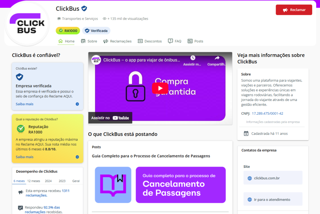 Por lá, a empresa possui o selo de reputação RA1000, o que é ótimo. Na plataforma de reclamações, as notas da ClickBus, dos últimos 6 meses, são divididas da seguinte maneira: