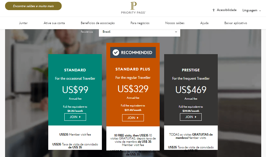 Prestige: US$ 469 por anos (39.08/mês) e tenha acesso ilimitado aos lounges.