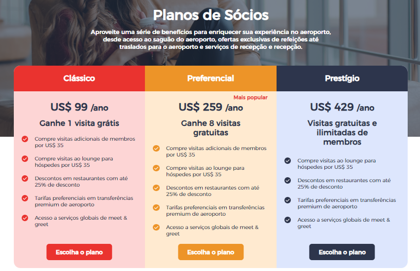 Além dos acessos para a sala VIP, os planos dão 25% de desconto em restaurantes vinculados ao programa, preferências nos transfers para aeroportos e serviços de recepção.