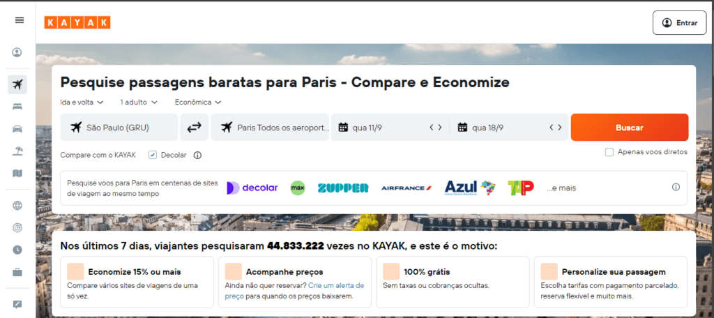 - Compare em múltiplas plataformas: Embora o KAYAK agregue muitos sites de viagens, vale a pena comparar as tarifas encontradas com outros buscadores, como o Skyscanner para garantir que está obtendo o melhor preço possível.