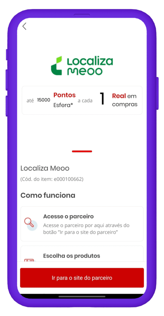 Para isso, basta ir na seção “Ganhe pontos” do app e procurar pela Localiza. A parceria só está disponível para o serviço de carro por assinatura (Localiza Meoo).