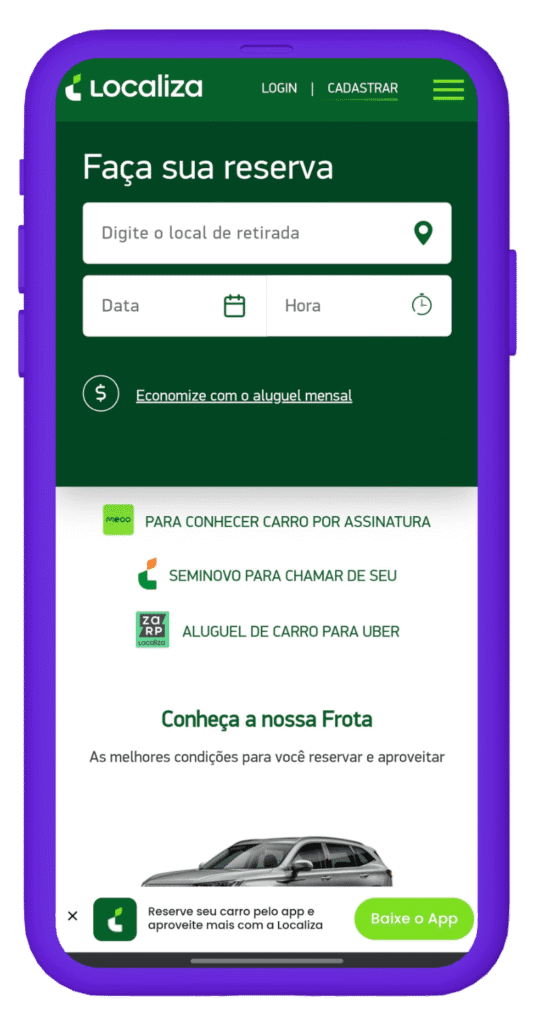 Ao entrar no site da Localiza pelo celular, você verá essa tela.