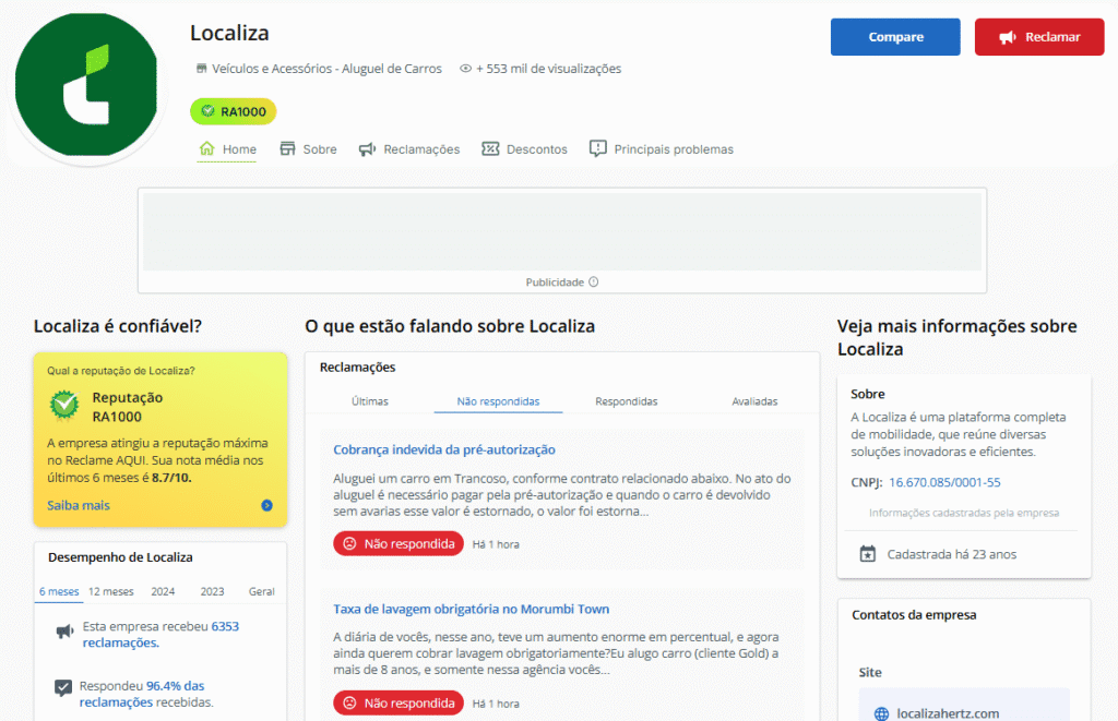 Por lá, a Localiza possui uma nota 8.7/10 e uma reputação classificada como RA1000, reputação máxima.