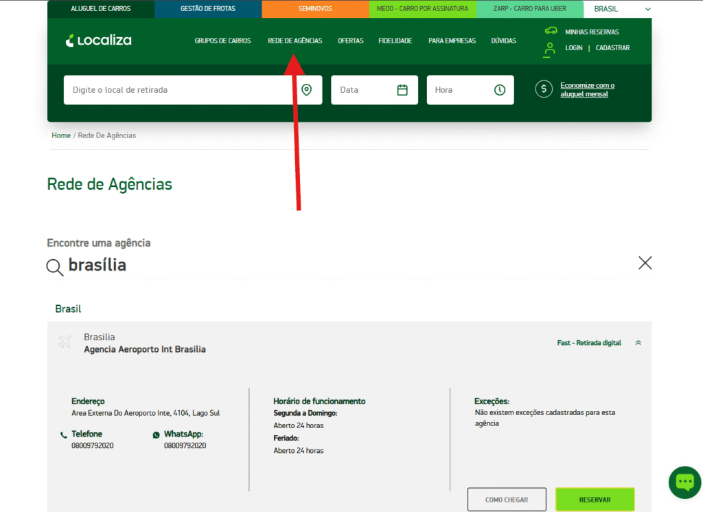 • Consultar localização e horário de funcionamento das agências da Localiza.