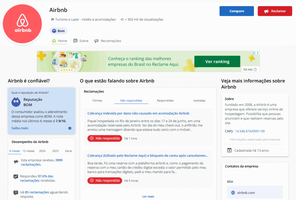 Perfil do Airbnb no Reclame Aqui. Consulta: 22/07/2025.