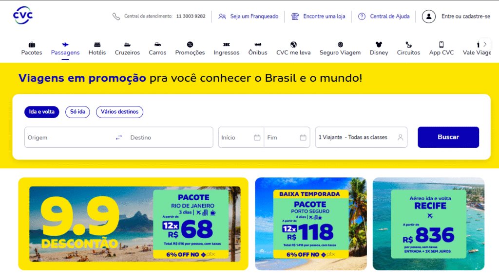 Como uma das maiores agências de viagem online do país, a CVC oferece uma vasta gama de opções não apenas de voos, mas de pacotes completos.