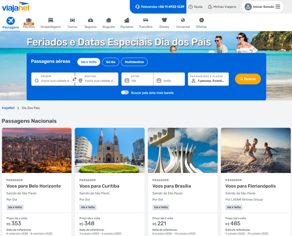 Na seção de “Dia dos Pais” há ofertas especiais nesse período sazonal. É possível encontrar passagens a partir de R$221.
