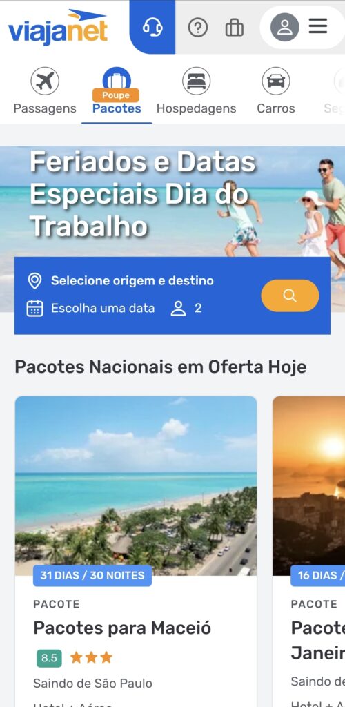 Página de promoções da ViajaNet para o Dia do Trabalhador.