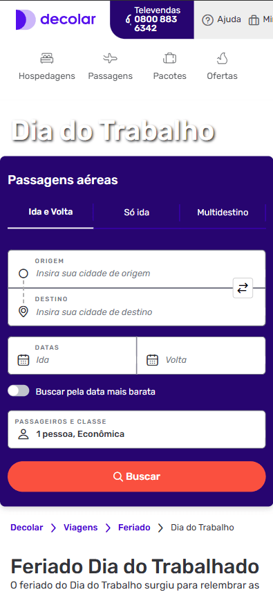 Página de promoções da Decolar para o Dia do Trabalhador.