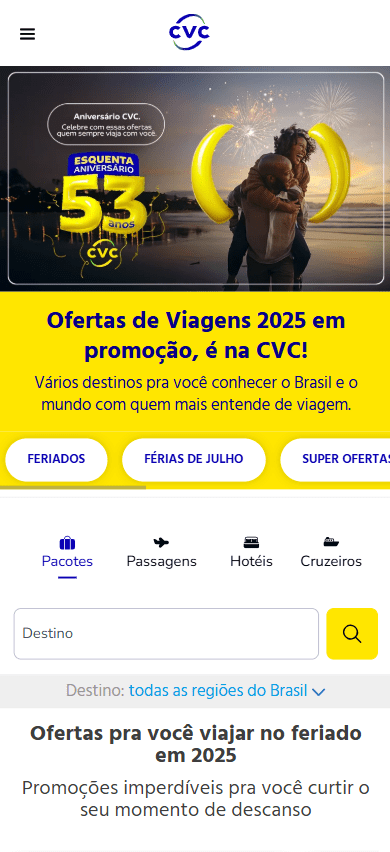 A CVC também é bem conhecida em oferecer pacotes personalizados que além de hotel e passagem, tem uma gama bem interessante de destinos e condições de acordo com cada objetivo.