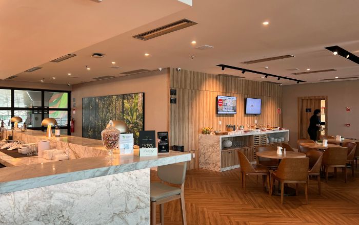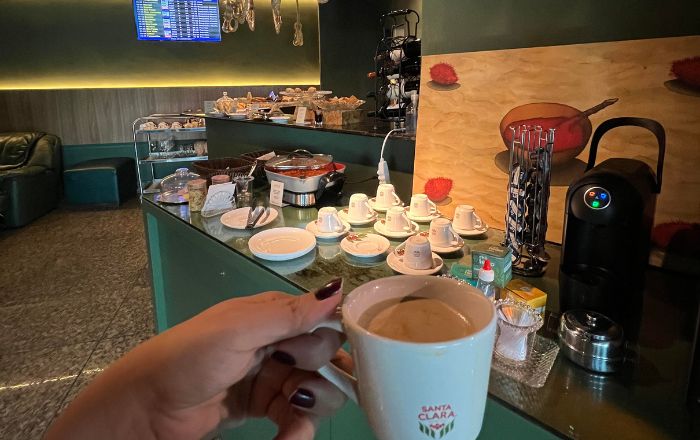 - Bar completo: um bar com uma extensa lista de bebidas e coquetéis está disponível, perfeito para quem deseja relaxar enquanto espera o voo;