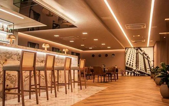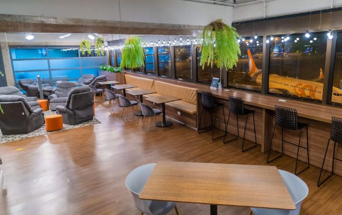 O lounge oferece serviços como alimentos, bebidas e espumantes, além de salas de reuniões e poltronas confortáveis para ter mais conforto durante a espera.