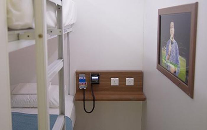Cada box possui um beliche e acomoda duas pessoas. O espaço conta com travesseiros e uma mesa de cabeceira, além de TV e ar condicionado e funciona 24 horas, diariamente.