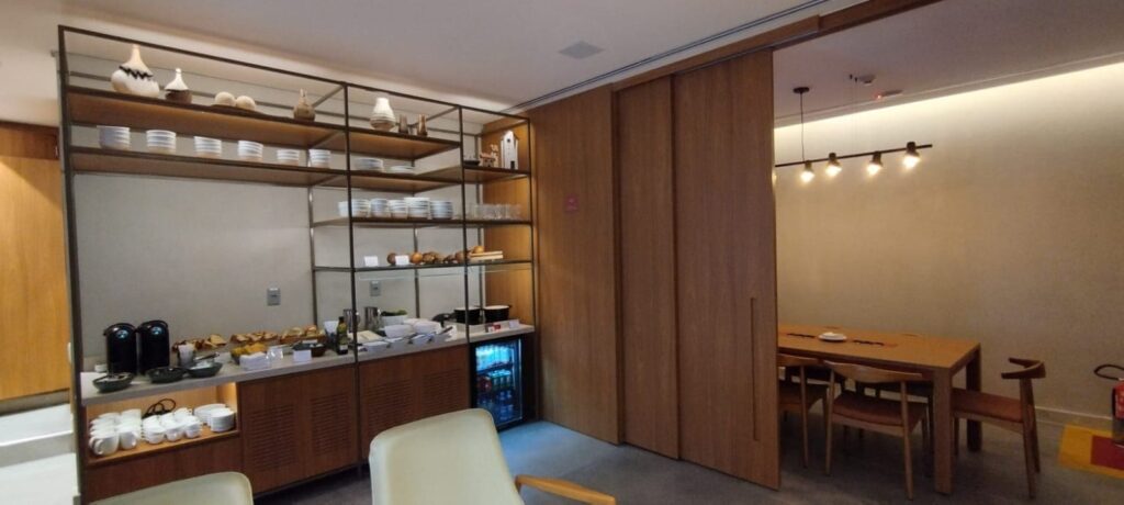 Além disso, o espaço oferece comodidades, buffet com lanches variados, bebidas quentes e frias (não-acoólicas), chuveiros, Wi-Fi próprio, poltronas para descanso, entre outras.