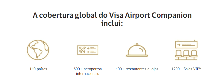 - Visa Airport Companion: Você poderá aproveitar salas VIP e descontos em restaurantes, lojas, serviços e muito mais. São mais de 1.000 salas VIP e restaurantes em mais de 450 aeroportos em 140 países.
