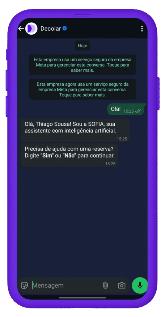 Salve este número em sua lista de contatos e inicie uma conversa. Assim, a Sofia da Decolar – assistente virtual – tentará solucionar suas dúvidas.