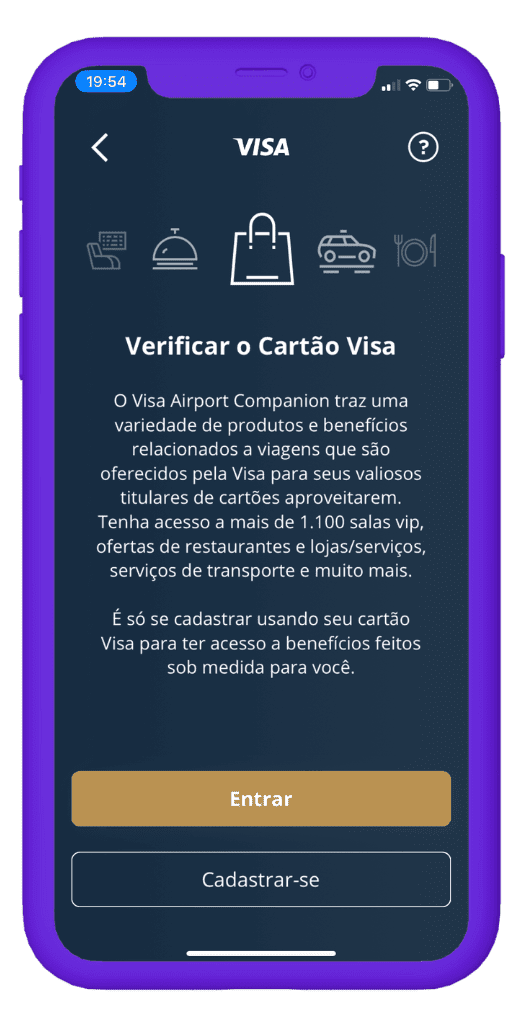 - Visa Airport Companion: Você poderá aproveitar salas VIP e descontos em restaurantes, lojas, serviços e muito mais. São mais de 1.000 salas VIP e restaurantes em mais de 450 aeroportos em 140 países.