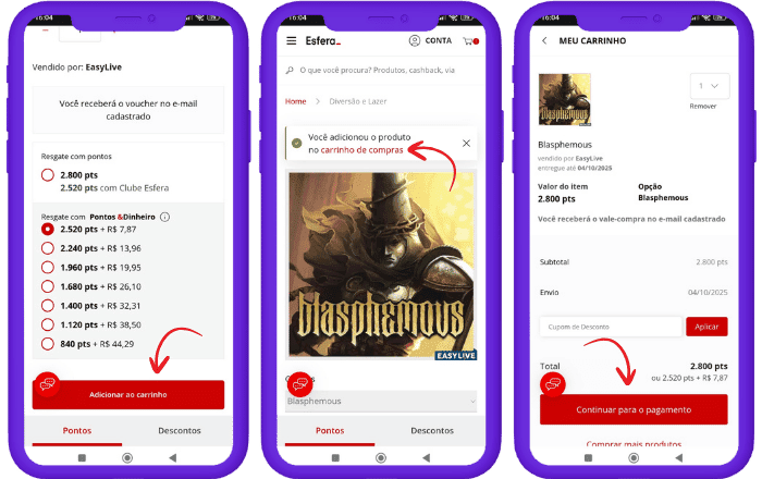 Na imagem acima, você pode consultar algumas opções para fazer o resgate. Pela primeira opção, por exemplo, é possível obter seu voucher para resgatar o Blasphemous combinando 2.520 pontos com apenas R$ 7,87.