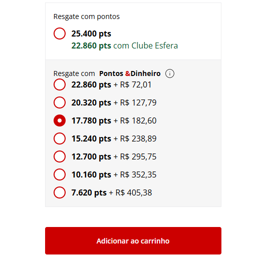 Graças à função Pontos & Dinheiro, você não precisa esperar juntar os 7.620 pontos restantes. Em vez disso, você pode complementar essa diferença com um pagamento em dinheiro (cartão ou Pix).