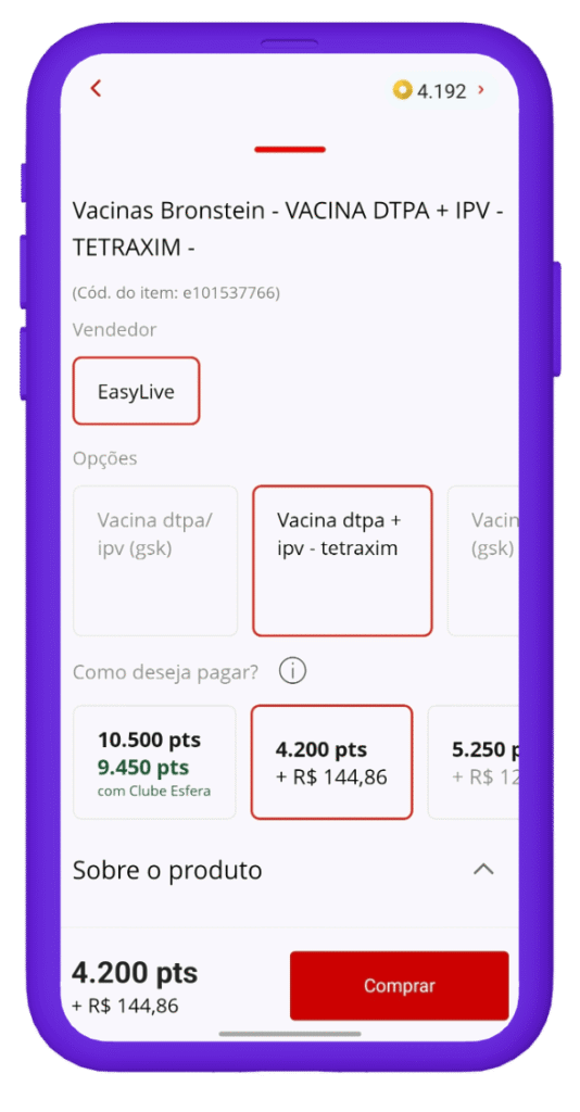 Os valores em pontos para resgatar o vale-compra de vacinas Bronstein são dinâmicos e podem ser alterados pelo programa Esfera a qualquer momento.
