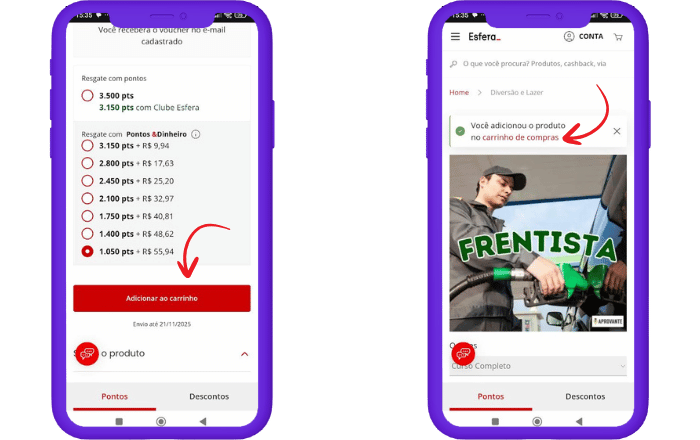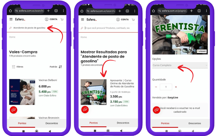 Com a Esfera, além da possibilidade de resgatar o curso utilizando apenas seus pontos, você também pode combinar sua pontuação com um pagamento em dinheiro, permitindo que você economize um valor bastante significativo de pontos e dinheiro.