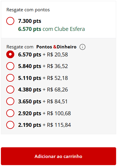 No exemplo acima, ao optar pelo Pontos & Dinheiro, o pagamento fica por apenas 6.570 pts + R$ 20,58, tornando o preço ainda mais acessível.