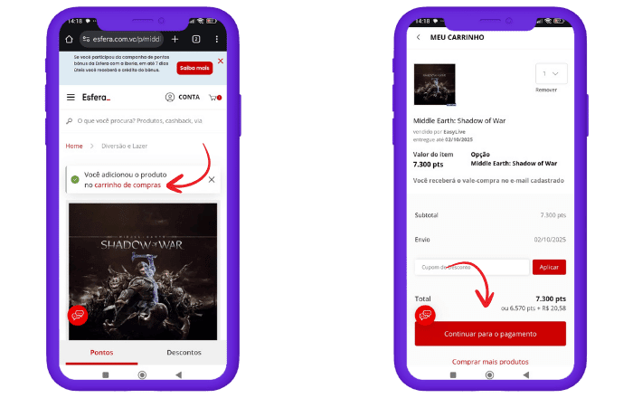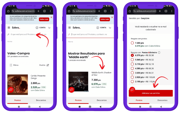 Também é possível comprar pontos diretamente pelo site da Esfera, o que pode ser uma boa saída para adquirir produtos em casos específicos ou aproveitar promoções imperdíveis.