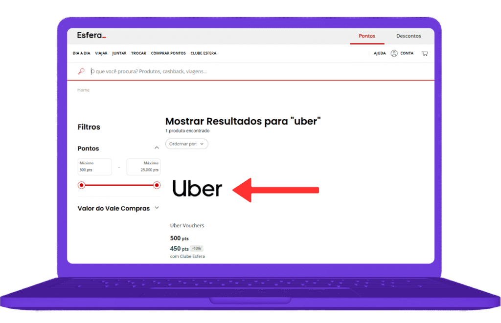 Uma das grandes vantagens da Esfera é a modalidade pontos e dinheiro (Pontos & Dinheiro). Se você encontrou um voucher que deseja resgatar mas não tem o saldo total de pontos, não há problema.
